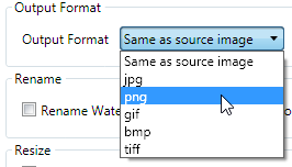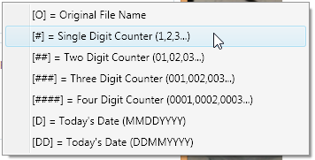 For instance if you want the selected images to be named in a series of numbers like 001.jpg, 002.jpg, 003.jpg and so on, you can use the macro [###]. Or if you want them to be named MyPhoto-01.jpg, MyPhoto-02.jpg etc, you can use the macro as MyPhoto-[##]. If you want to add today's date to the image name you can use the [D] or [DD] macros. If you want add a prefix or a postfix to the original image name you can do so with the [O] macro. You don't have to insert the file extension. It will be added automatically depending on the output type you have selected.