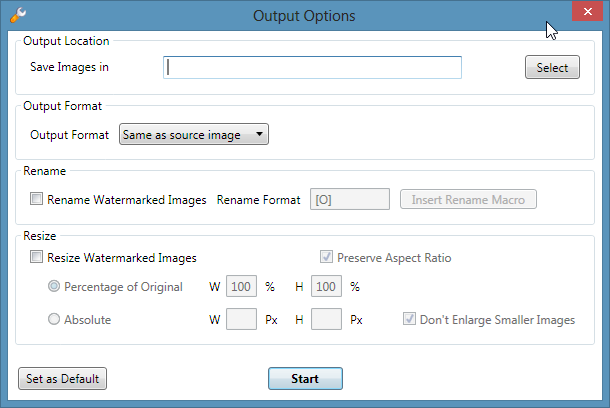 You may add a watermark if you wish, if you just want to batch convert, you can skips the watermarks. When you click on the Start Watermarking button you will see the output options window.
