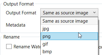 On the Output options window, select the new image format from the Output format dropdown menu.