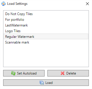 To set a watermark on auto load you need to save it first. After you save the watermark you need to click on the Add Watermark button and select Add Saved Watermark option. When the Load Settings window opens you can see a new button called Set Auto Load under your list of saved watermarks. Select a saved watermark and click on the button to Auto load the selected watermark when uMark starts. The watermark you have set for auto load will show up in bold in the saved watermarks list. You can choose another watermark setting to auto load by selecting it and clicking the Auto load button.