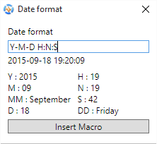 Default format is Y-M-D H:N:S which is entire date string. You can change the format the way you like and can instantly see the preview how the date will look like below. That is only for a preview, the actual date that will be inserted will be according to the macro you have selected in the format you have chosen. uMark will even remember the format for you so you don't have to set the format every time you enter a date based macro.