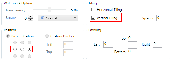 Positioning options for vertically tiled watermarks