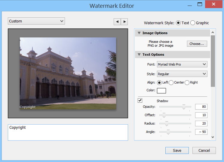 Set text watermark font, color, shadow