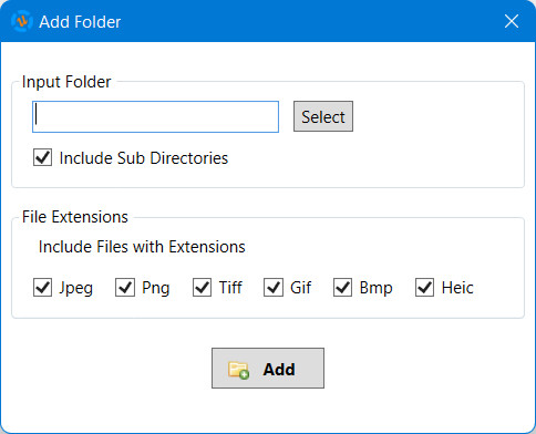 You can select the types of photos you want to include. By default, all common picture types are selected that is JPG, PNG, GIF, TIFF, BMP and HEIC. Click on Add and all the photos in the selected folder will be added to the list of photos to be watermarked.