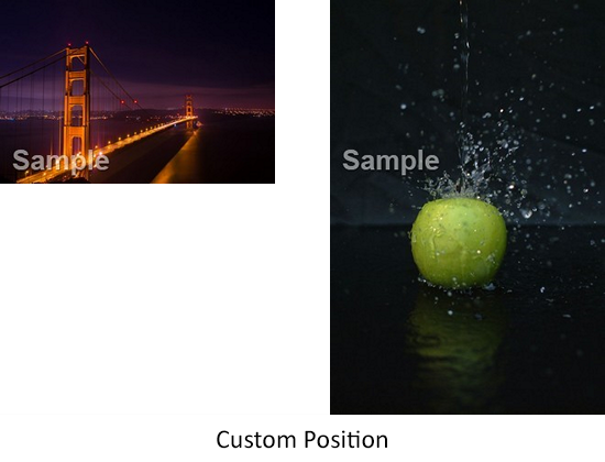coordinates regardless of the size of the image being watermarked. If you want your watermark to appear at a fixed spot on all photo regardless of the size or orientation of the photos then you can use the custom position.